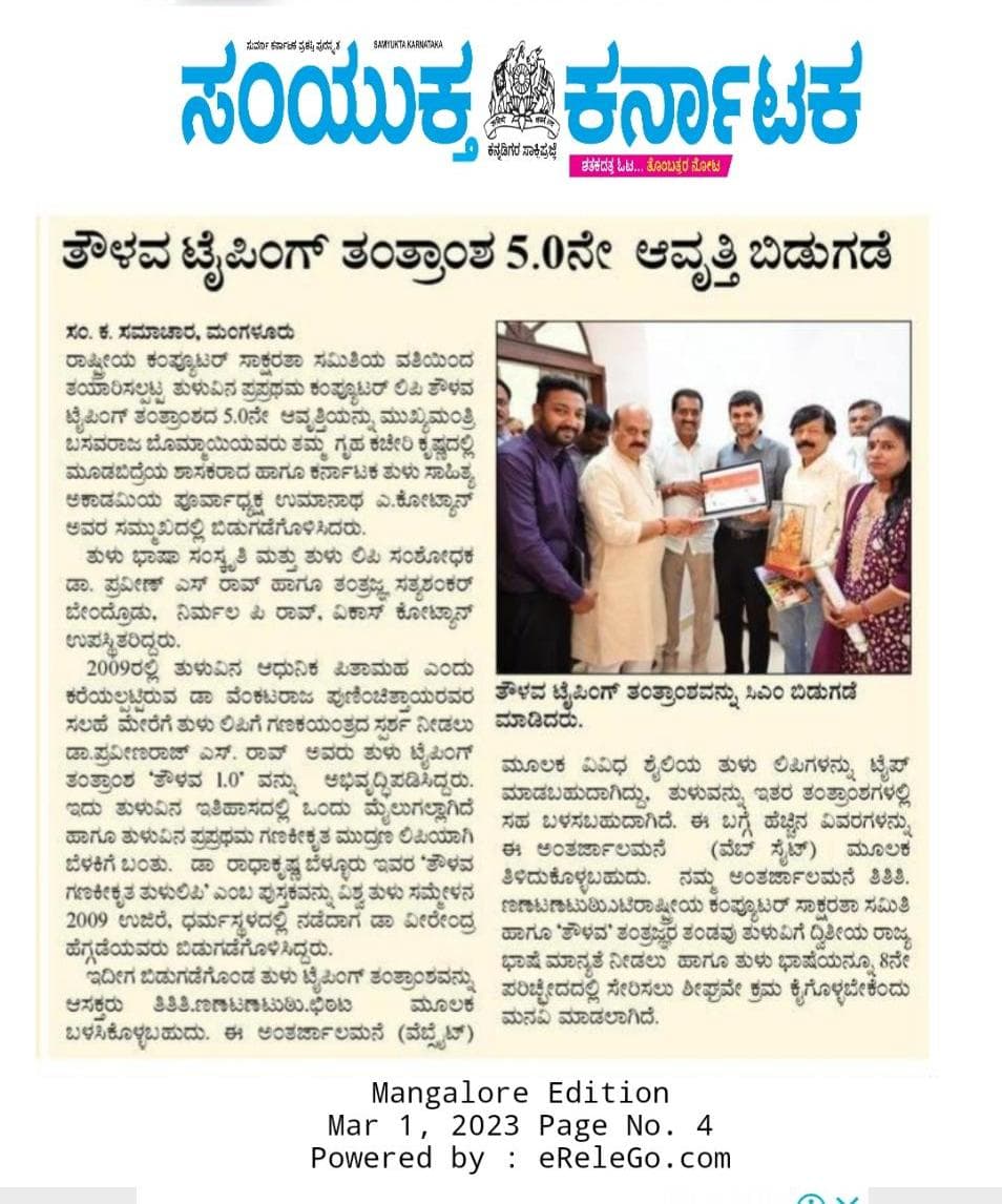 In 2009, the Tulu font and Software "Thawlava" 1.0 and were released at Talapadi by Dr. Palthadi Ramakrishna Achar, President of the Karnataka Tulu Sahithya Academy. This font and software were developed by Praveenraj S. Rao and his team, who contributed significantly to preserving and promoting the Tulu language.